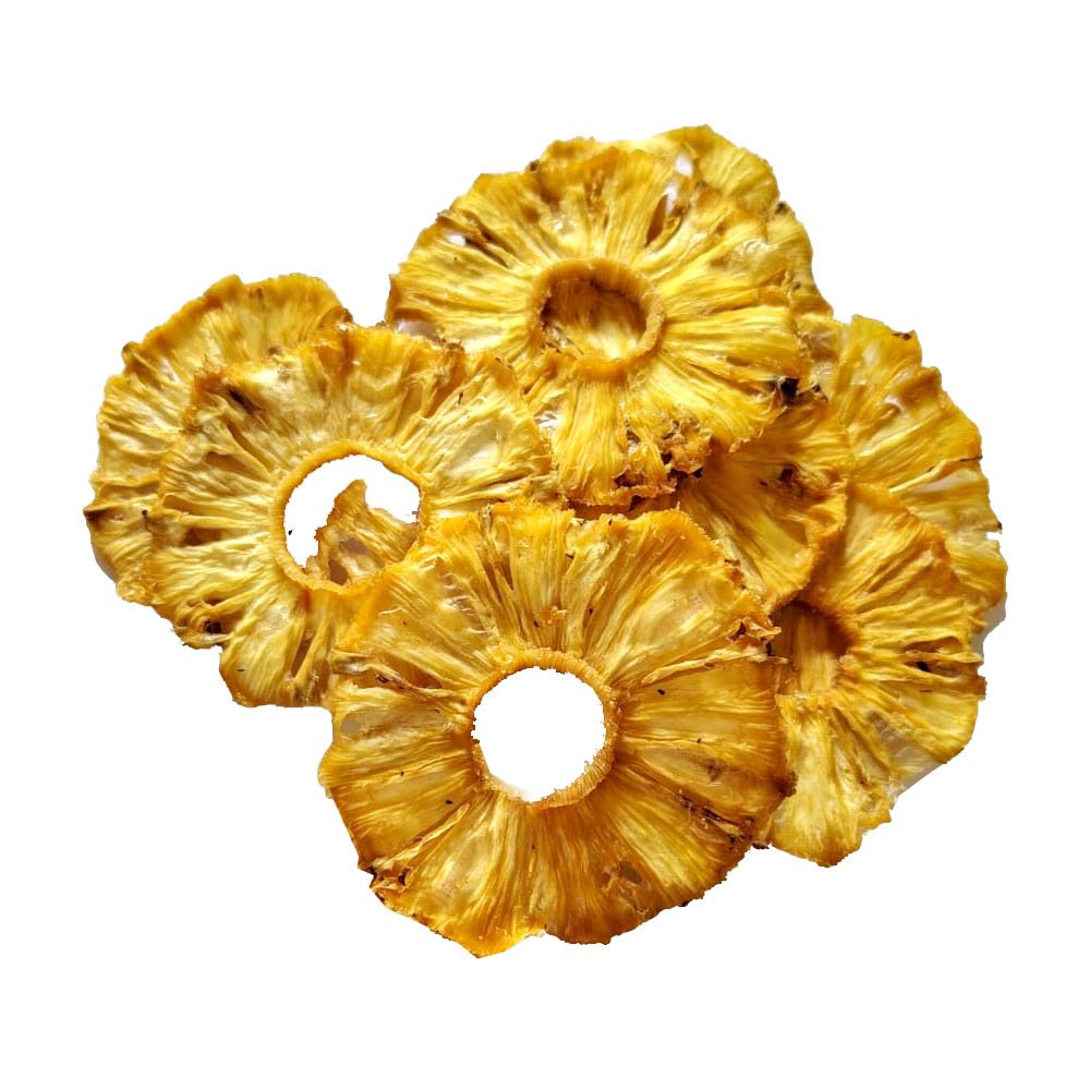 Dehydrated pineapple is made by removing most of the water from fresh pineapple slices using drying methods. This process helps preserve the fruit, extend its shelf life, and concentrate its natural sweetness and flavor.